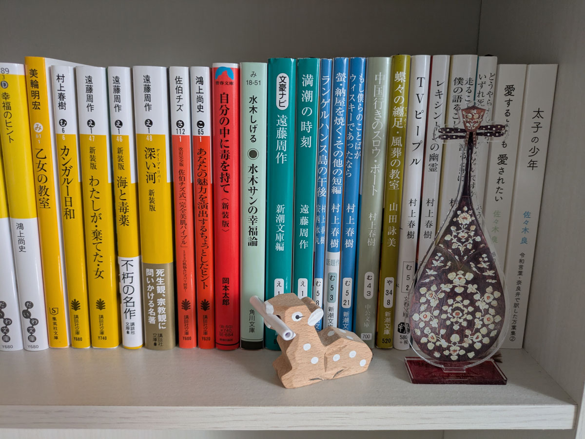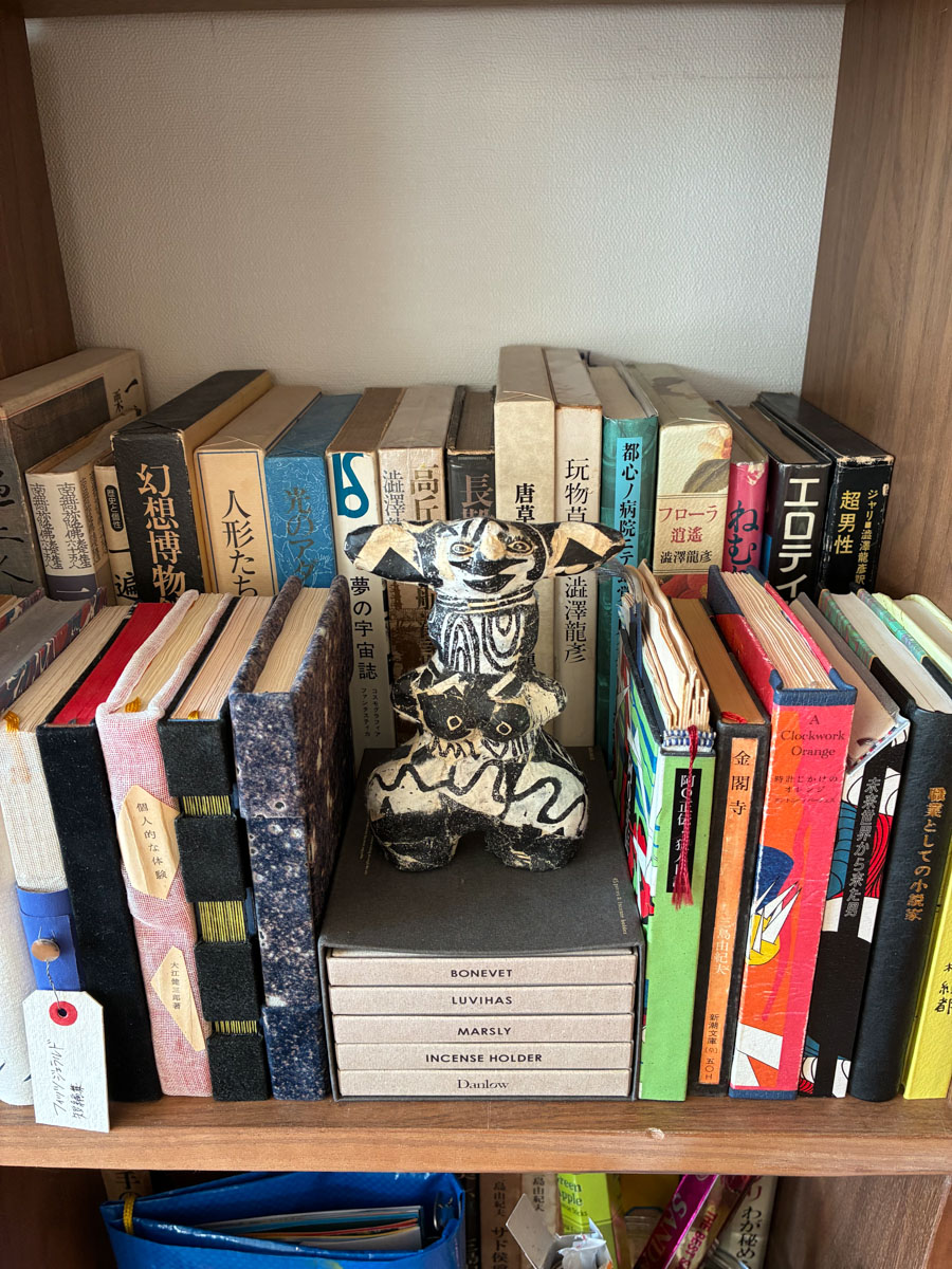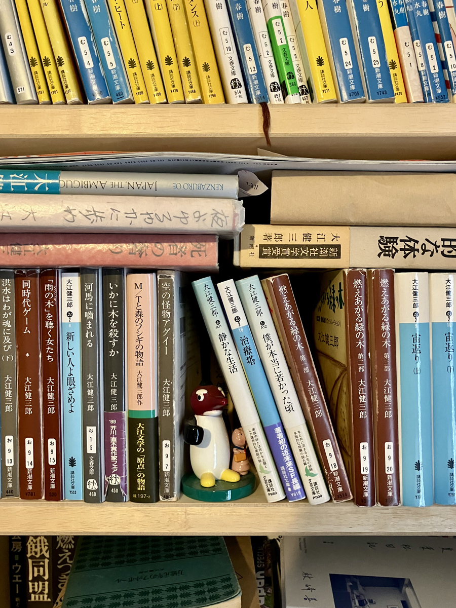 「かつて自作した本棚に、ずいぶんまえから暮らすテングーの香立。いつからかなんとなく本棚の住人に。本棚にはいまのところ秩序はほぼないのですが、大江健三郎と村上春樹だけそれぞれ分けて並べています。テングーは現在、大江ゾーンに」(団地のもぐらおばけ)