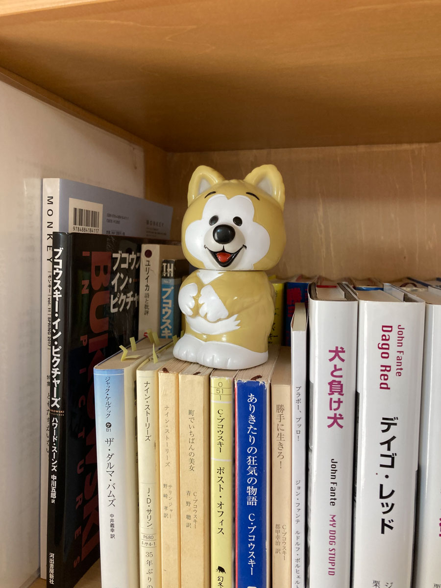「どんな気分のときも私を癒してくれる、北都銀行のキャラクター『ほっくん』の貯金箱です。ジョン・ファンテ『犬と負け犬』に登場する主人公の犬・スチューピトと同じ “秋田犬” なので、本棚ではその隣に並べています」(竹下)