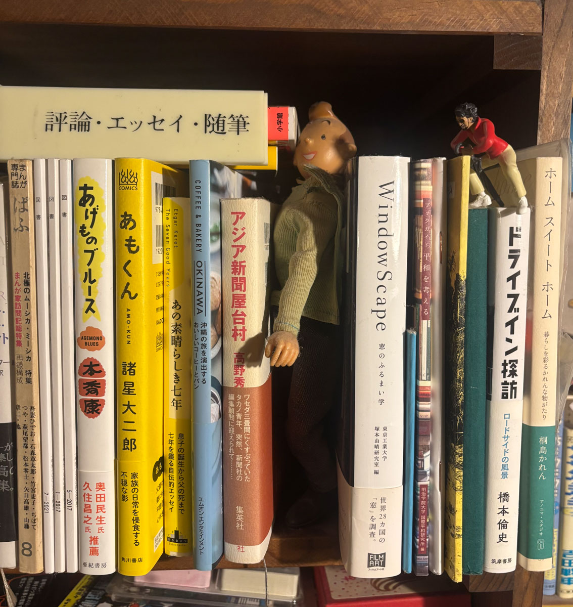 「30年ほど前、広島の雑貨店で購入したタンタンのフィギュア。当初は正面を向いてのびのびとしておりましたが、整理できず増殖していく本にどんどん圧迫され、いつのまにか本棚に潜む怪人に……」(38)