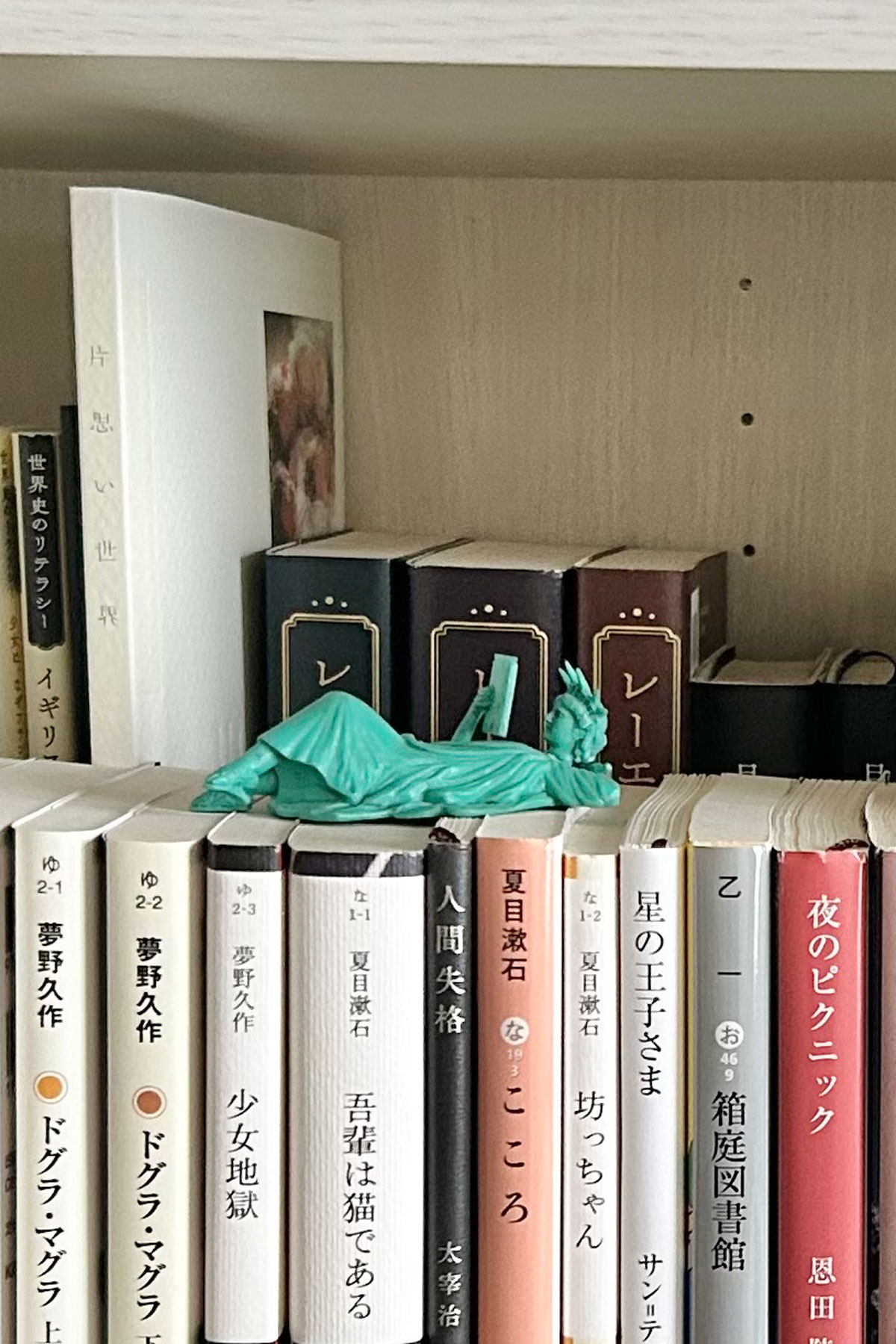 「ガチャガチャのコーナーで見つけた自由の女神シリーズ。どの子が出ても嬉しいなと思い回したのですが、読書する女神が出てきてくれたので、本棚に住んでいただくことにしました」(だしまき)