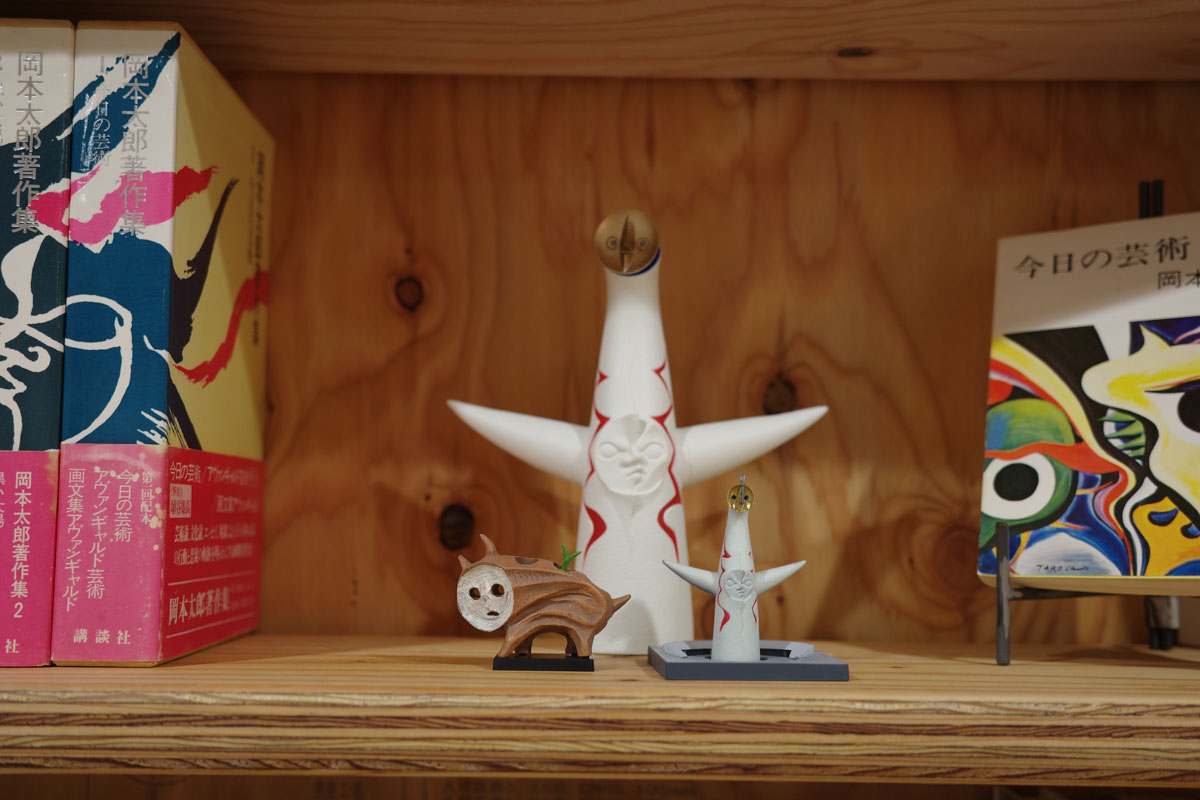 「縄文・はにわをテーマに岡本太郎作品もいくつか置いてあります。元々は、岡本太郎のフィギュアだけだったのですが、ガチャガチャや貰ったものを飾っていたら、どんどん仲間が増えていきました。今は、お笑い芸人の本だけで構成されているスペースに住まわせています」(左腕肥大)