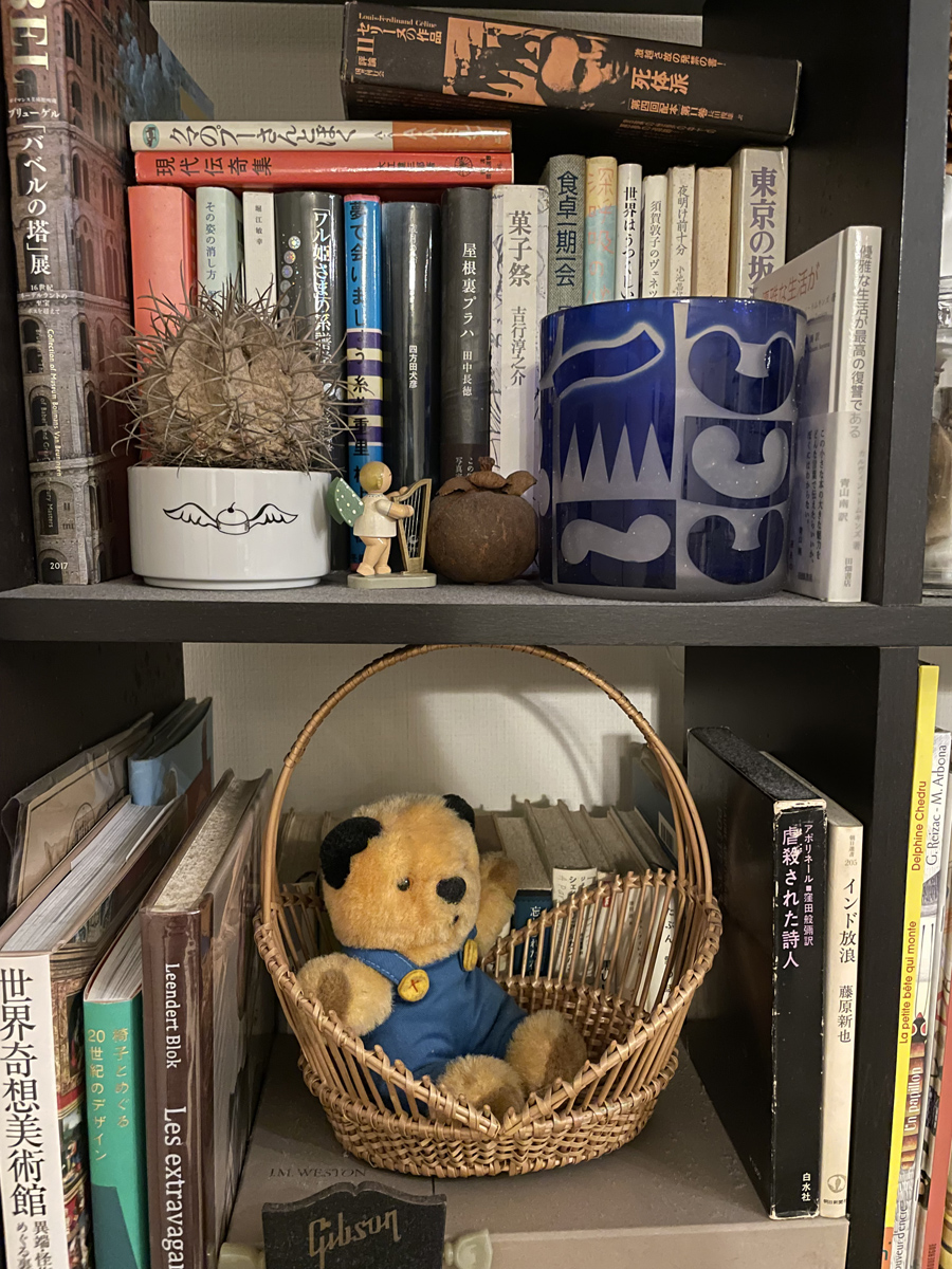 「約2年前にアンティークショップで買ったテディベアです。イギリスのテレビアニメのキャラクターだと店主の人から教えてもらいました。うす汚い感じが好き。仕事でご一緒しているお姉さまからいただいた、リトアニアかどこかの国のお土産のカゴに入れて、本棚に飾っています」(かーりー)