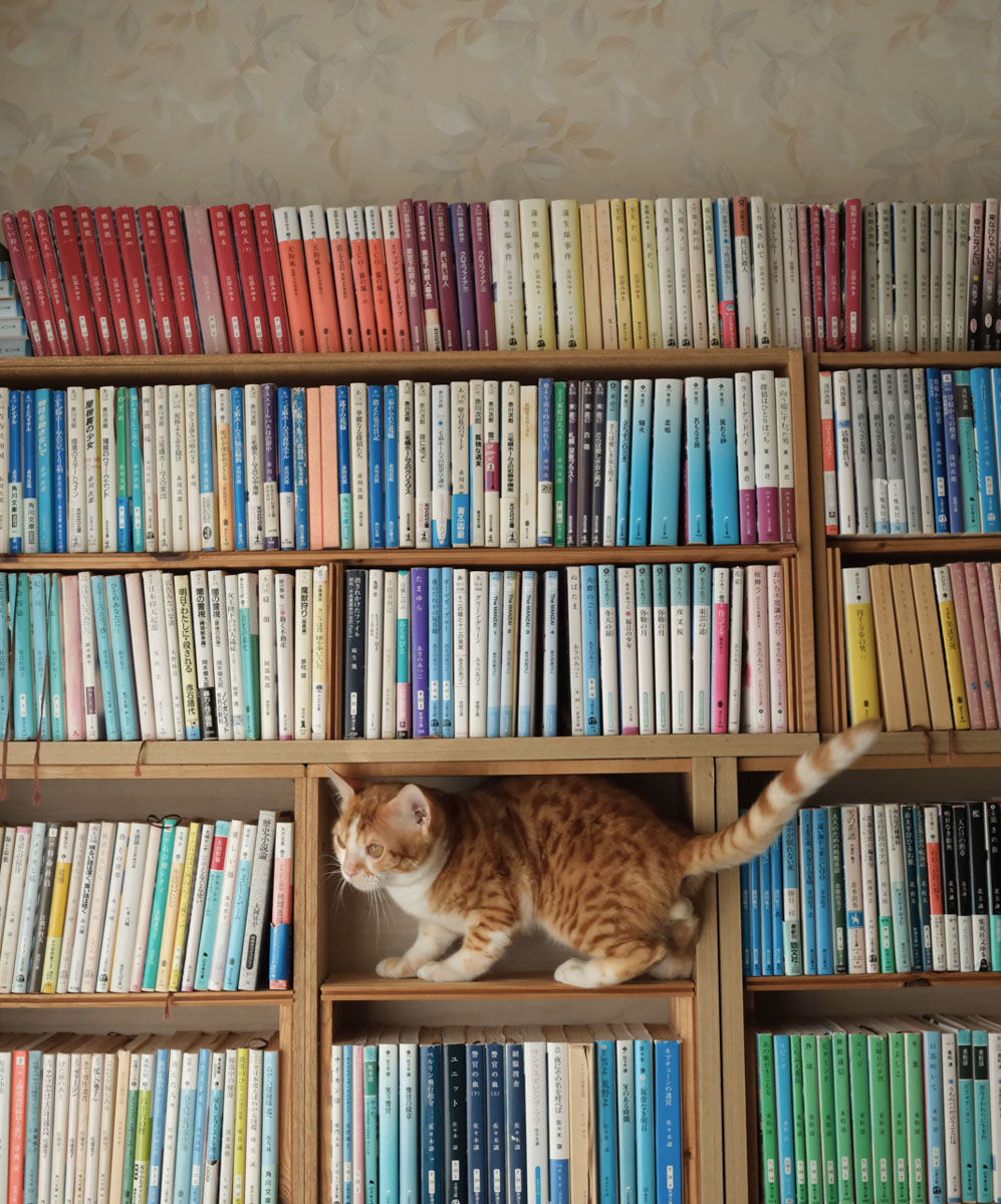 「愛猫のオルネは本棚の探検が大好き。オルネ用にどこかの一角を空けておくと、そこで寛いだり外を眺めたり、読書する私を静かに見守ったりしています」(サトウミキ)