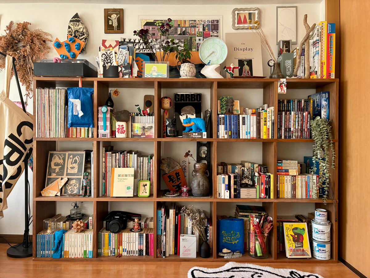 「本棚のテーマは“自分自身”。お気に入りを並べ、自分の写し鏡のような空間を目指しています。オハラカズヤ氏の木版画による立体作品が、数ある住人の中でもベストオブパートナーです」(竹内翔海)