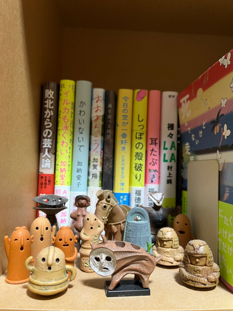 「縄文・はにわをテーマに岡本太郎作品もいくつか置いてあります。元々は、岡本太郎のフィギュアだけだったのですが、ガチャガチャや貰ったものを飾っていたら、どんどん仲間が増えていきました。今は、お笑い芸人の本だけで構成されているスペースに住まわせています」(左腕肥大)