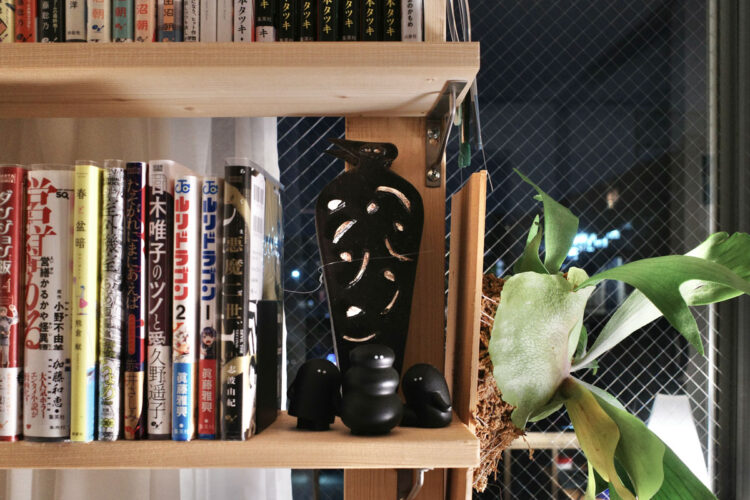 「かつて自作した本棚に、ずいぶんまえから暮らすテングーの香立。いつからかなんとなく本棚の住人に。本棚にはいまのところ秩序はほぼないのですが、大江健三郎と村上春樹だけそれぞれ分けて並べています。テングーは現在、大江ゾーンに」(団地のもぐらおばけ)