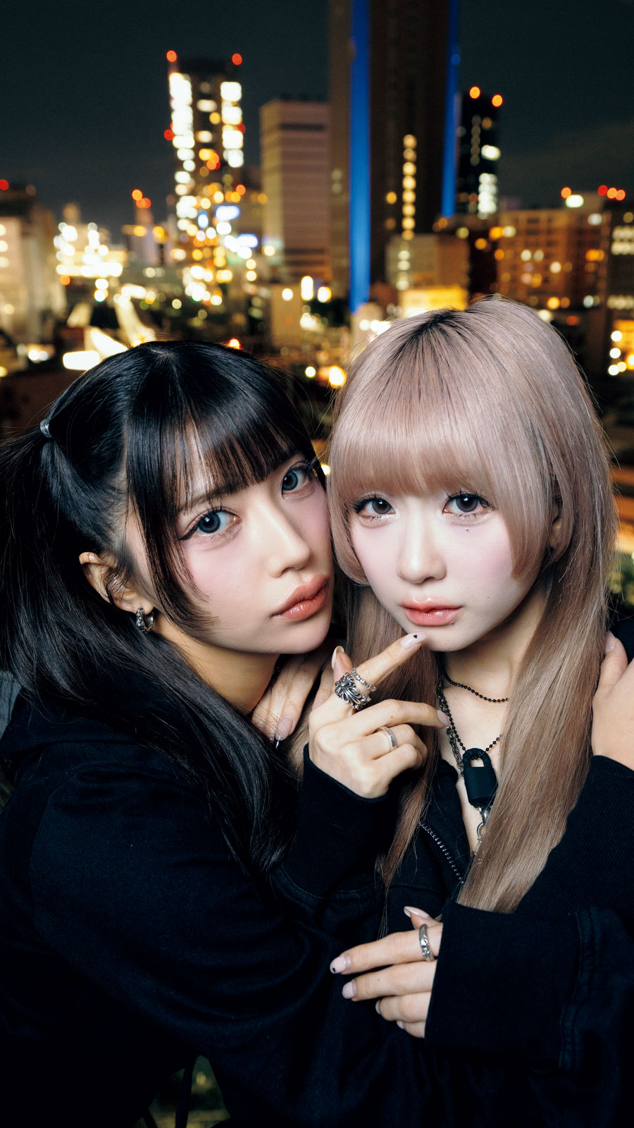 「私たちの表現には、パッと見たときに一瞬で感じるパートナーとしての絶対的な関係性が、ビジュアルに漏れ出ていると思います。それは言語化できない何か。だからこそ今まで、狙ってやったことなんて一つもない。キスしてる写真とかも、あくまで誰かが捉えた一瞬にしかすぎないんですよ。だから、くっついて!って言われてくっつくのは何か違うなと思っちゃう。女の子2人組アイドルって過去にもいて、たまにそういう方たちのことを引き合いに出して言われたりもするんですけど、そんなのも考えたことがなかった。あ、2人組っていうカテゴリがあるんだ?って言われてから初めて知ったんですよね」(りえ)