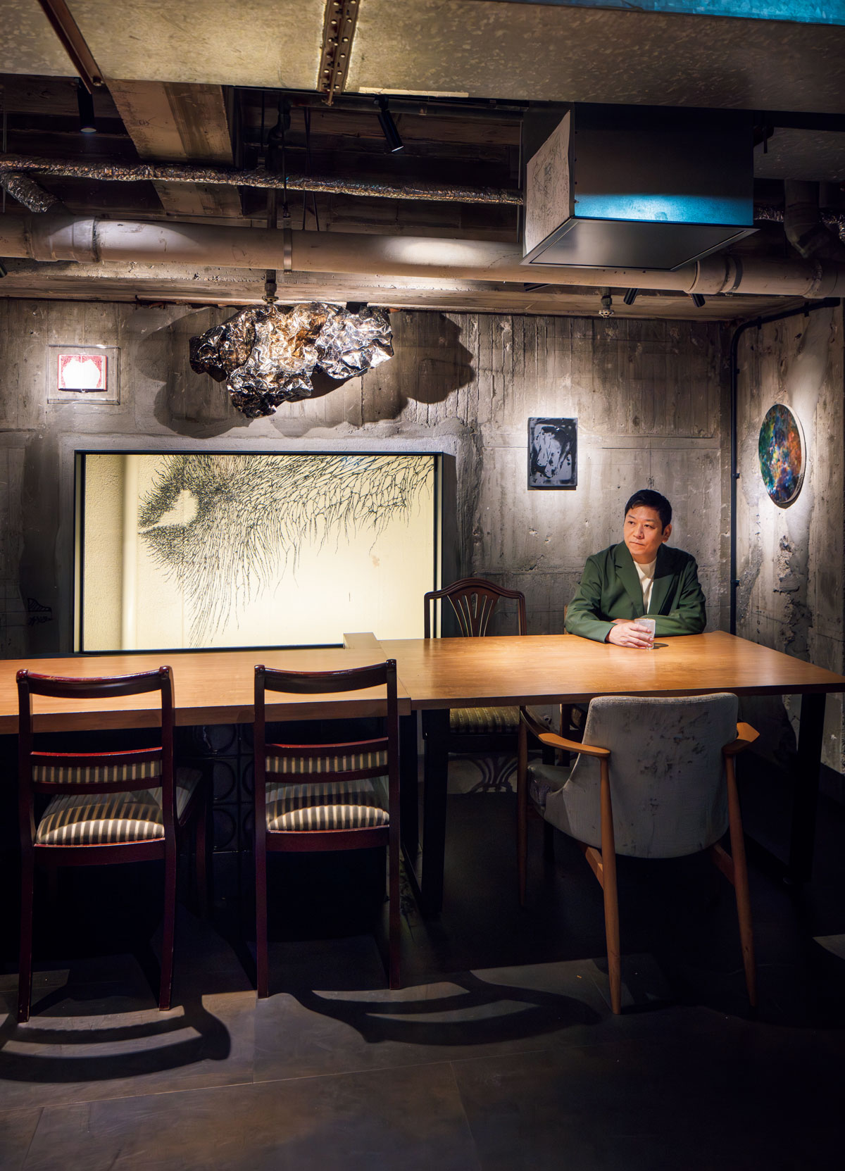 今宵、彫刻家の名和晃平さんが足を運んだのは、祇園四条の雑居ビル。作家仲間たちや京都芸術大学の卒業生らの作品が飾られている半会員制バー〈イクリプシス〉だ。