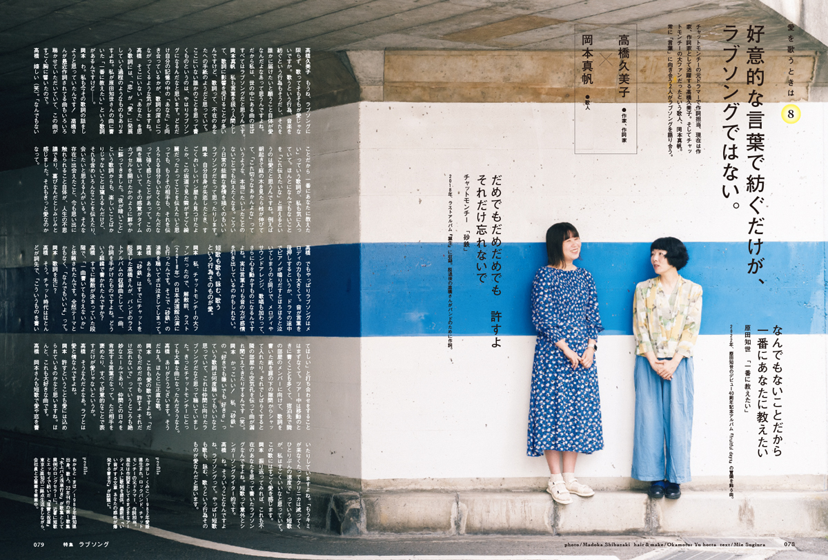 チャットモンチーの元ドラマーで作詞担当、現在は作家、作詞家として活躍する高橋久美子。そしてチャットモンチーの大ファンだったという歌人、岡本真帆。常に「言葉」に向き合う2人がラブソングを語り合う。