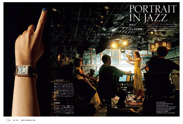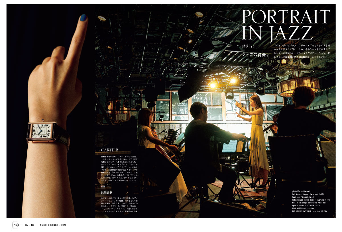 人気ジャズ・ミュージシャンたちが着ける、新作の腕時計と、そのスタイルサンプル。