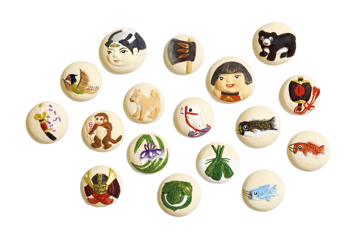 また、博多人形の職人たちは個々でも独自のおはじきを作っており、今回ご紹介するのは梶原博多人形工房による「端午の節句」をテーマにしたおはじき。こいのぼりや兜(かぶと)などお馴染みのモチーフがかわいらしいおはじきになっています。