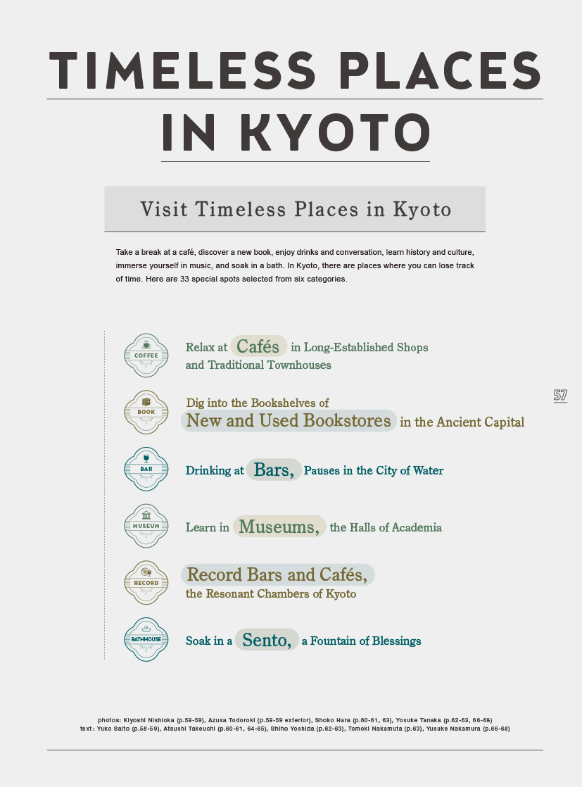 Take a break at a café, discover a new book, enjoy drinks and conversation, learn history and culture, immerse yourself in music, and soak in a bath. In Kyoto, there are places where you can lose track of time. Here are 33 special spots selected from six categories.