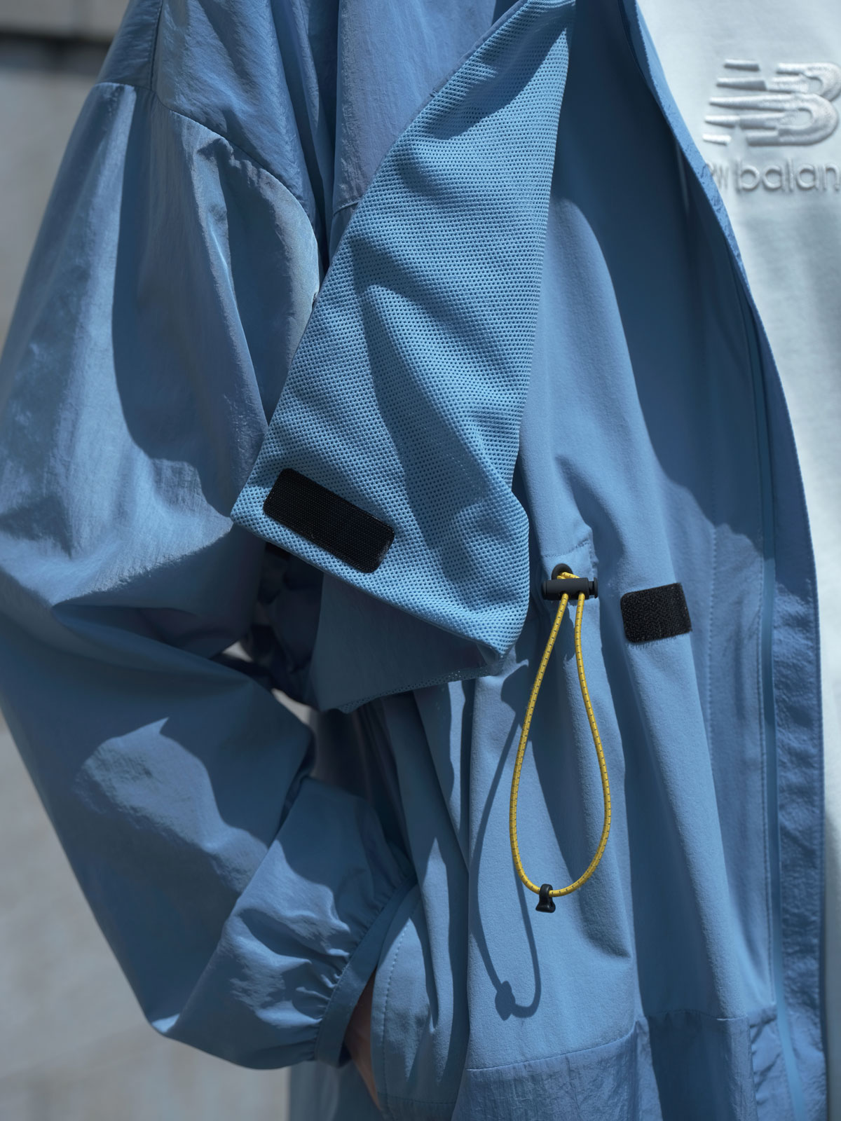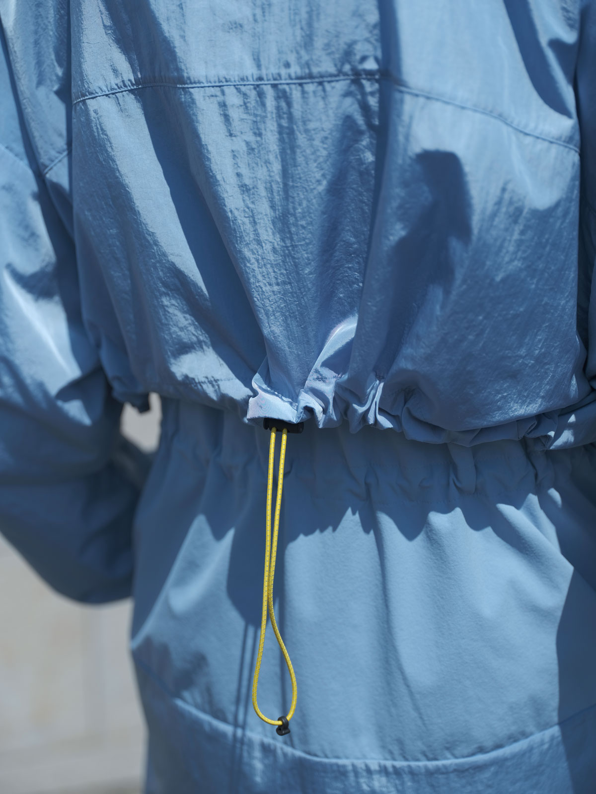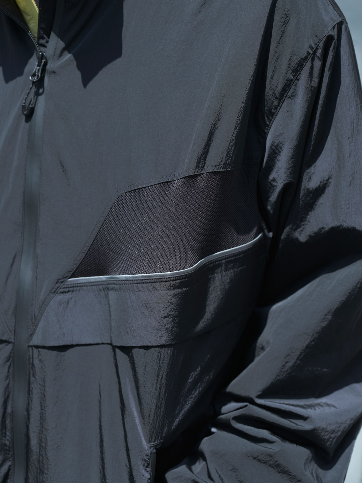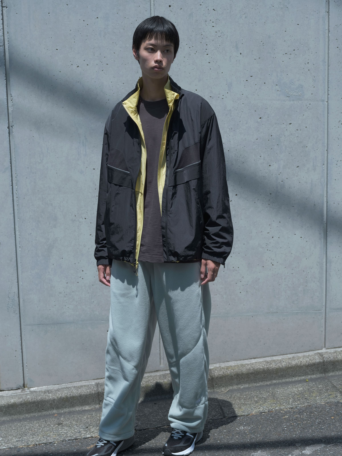 トップスとしても羽織り物としても使える、実用的な一着ですよね。もちろん普通に着ても様になるけれど、今回は少し遊んでみたいなと。ブラックとイエローを2枚重ねてジャケットの存在感をより引き立たせてみました。内側のものに比べて外のジャケットのドローコードをより強めに絞って、2枚でシルエットに差をつけることで、うまくレイヤードさせています。