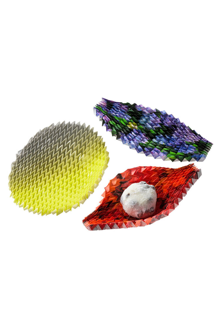 プリーツのお皿 (左)ラウンド(灰黄 2本 *箱入り) H39.6×W35cm*最大 1,870円、(右)スクエア(紫陽花と紅葉 各1本 *箱入り)H20×W35cm*最大 各1,210円