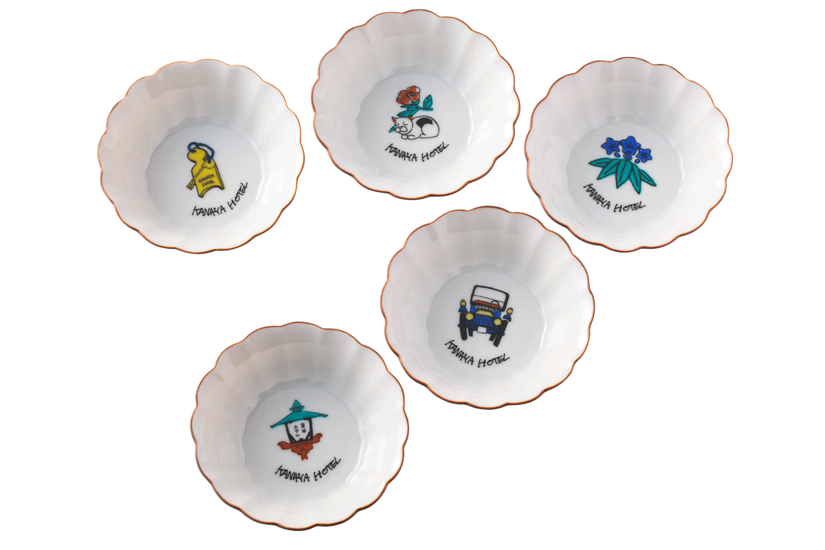 明治6年にスタートした「日光金谷ホテル」は、“現存する日本最古のリゾートホテル”と言われている。オリジナルグッズも充実していて、その中の一つが九谷焼の菊小鉢。昔ながらの鍵の形をした「ルームキー」や、象徴的な「外灯」、施設内にある彫刻「眠り猫」、ホテルのロゴマークにもなっている「笹竜胆」、かつて送迎に使われていた「フォード車」といった、ホテルと縁のあるモチーフがイラストであしらわれた全5種類を展開する。