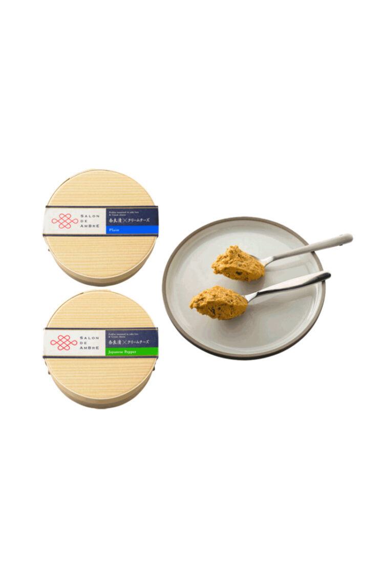 奈良漬×クリームチーズ「プレーン」 100g1,080円。奈良漬×クリームチーズ「山椒」 100g1,080円。2箱入り化粧箱(白)1箱330円。賞味期限:60日。