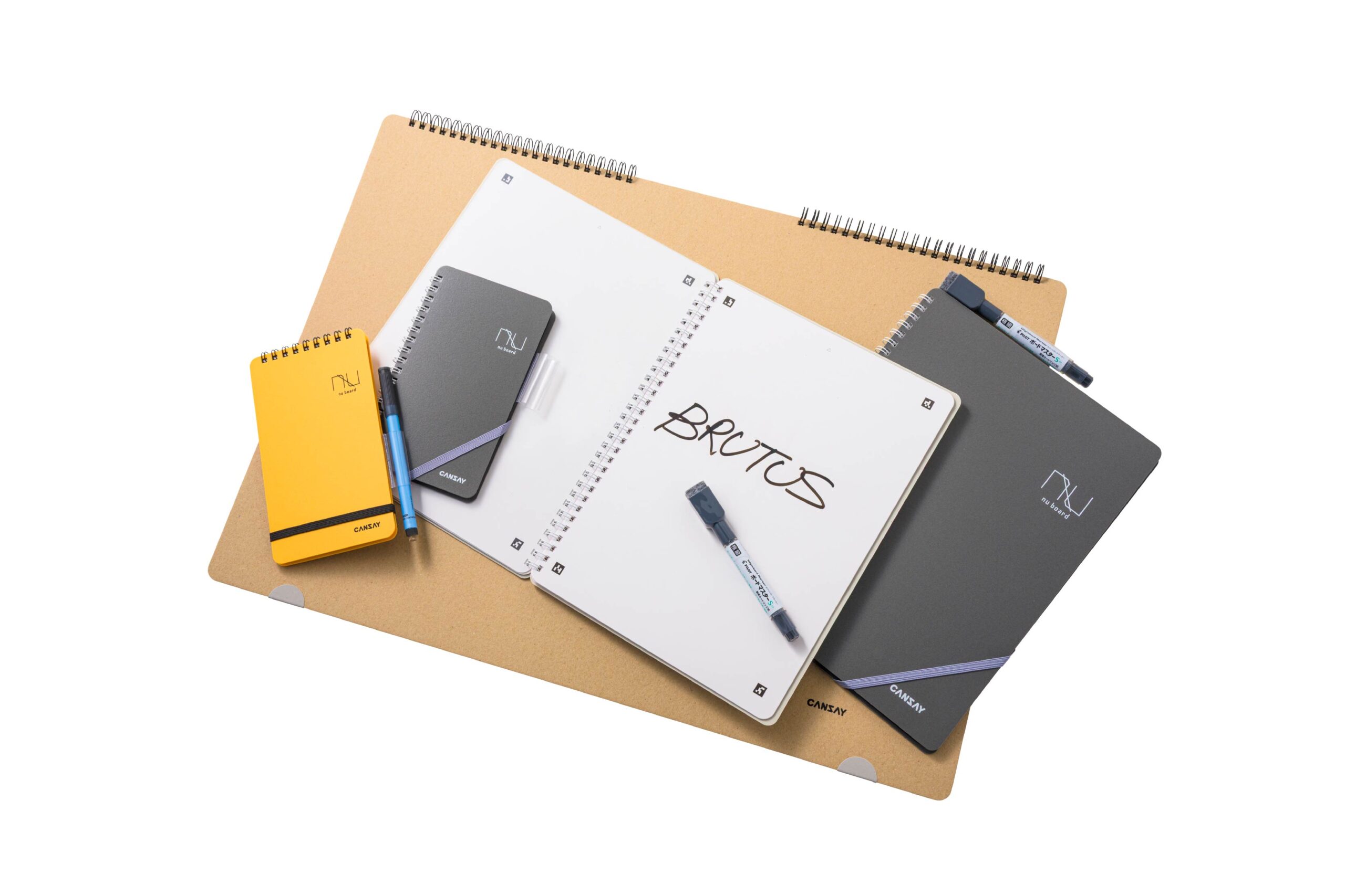 持ち運びもしやすくどこでも広げられるコンパクトなリングノート型のホワイトボード。一般的なボードと変わらず、ホワイトボード用マーカーとイレーザーで書いたり消したり自由自在。