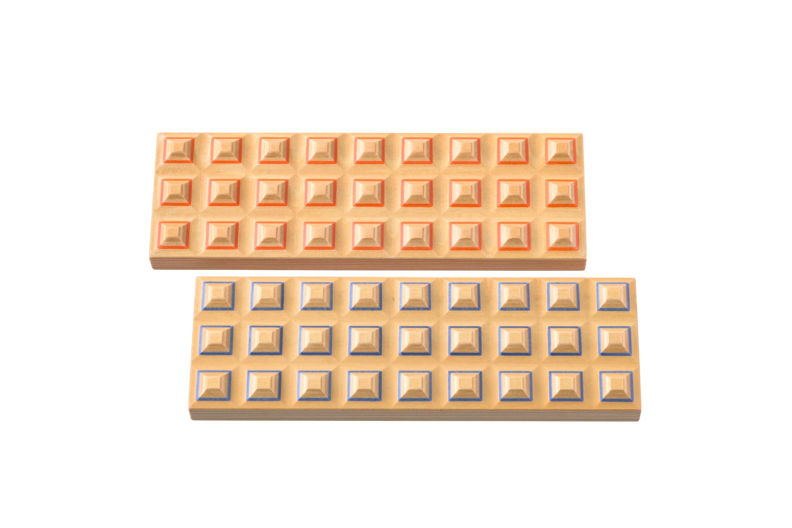合板の表面を削ることで現れる、色再生紙と木材を張り合わせた層が美しい。板チョコのような形は、シンプルながらもちょっとした凹凸が引っ掛かりになるため、小物を置くのに最適だ。