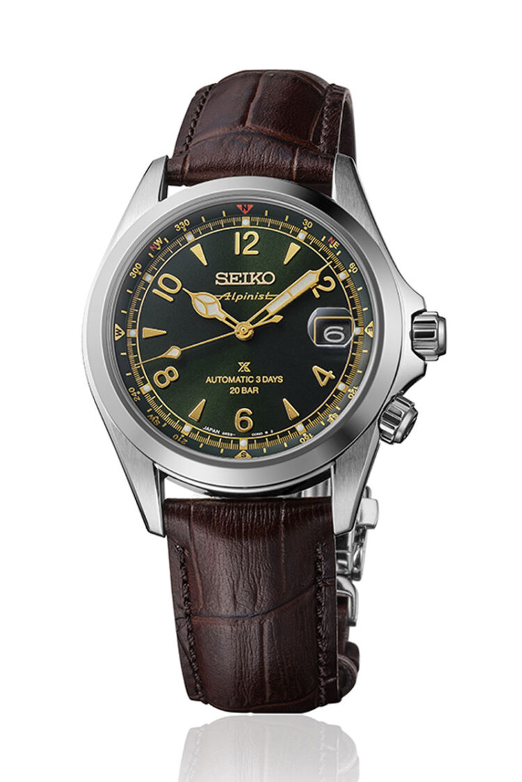 続いて「レザーストラップベルトが好きなんですよ」と語り、腕に着けたのが「アルピニスト」。〈セイコー〉初のスポーツウオッチ「ローレル アルピニスト」をルーツにもつ、モダンかつクラシカルなデザイン性を兼備した名機だ。