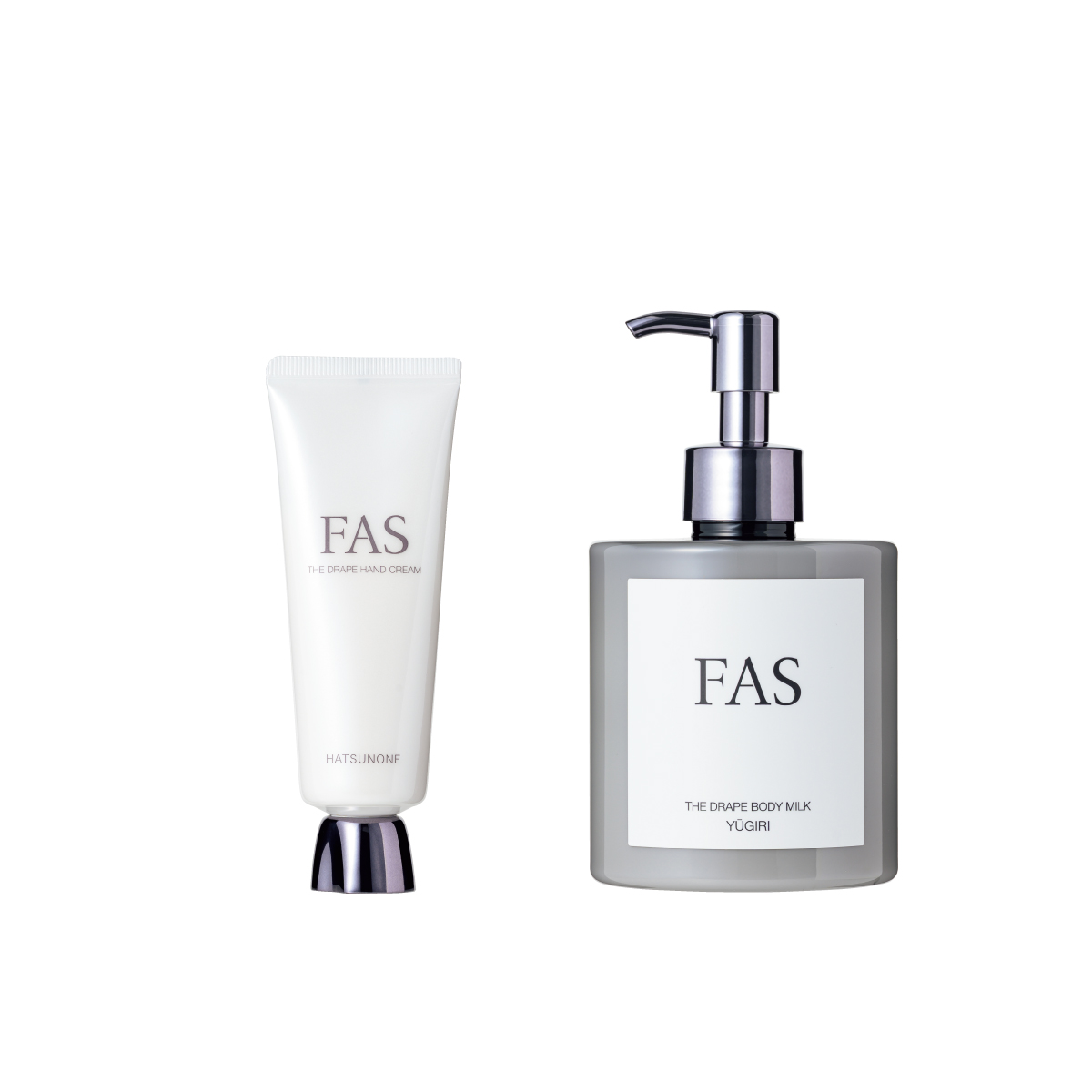 〈FAS〉初のボディケアアイテムは、日本で古来愛される繭を採用した美容成分「国産繭シルクエキス」を配合。2種のタンパク質が、大人のボディや手に潤いとハリを与えて、同時に紫外線対策効果も。香りにもこだわり、四季を連想させる奥深い香り「YŪGIRI」と「HATSUNONE」をラインナップ。