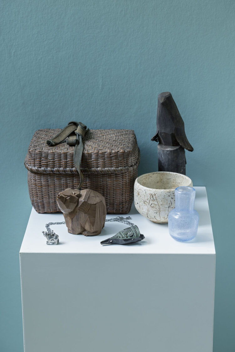 安藤夏樹のコレクションを詰め込んだ「宝箱」。柴崎重行の木彫り熊、エリック・ホグランの花瓶、江戸時代のお鷹ぽっぽ、長谷川竹次郎の熊のチャームネックレス、砂澤ビッキの首飾り、内田鋼一の器。これらを横田峰斎の竹籠に詰めたスペシャルBOX。
