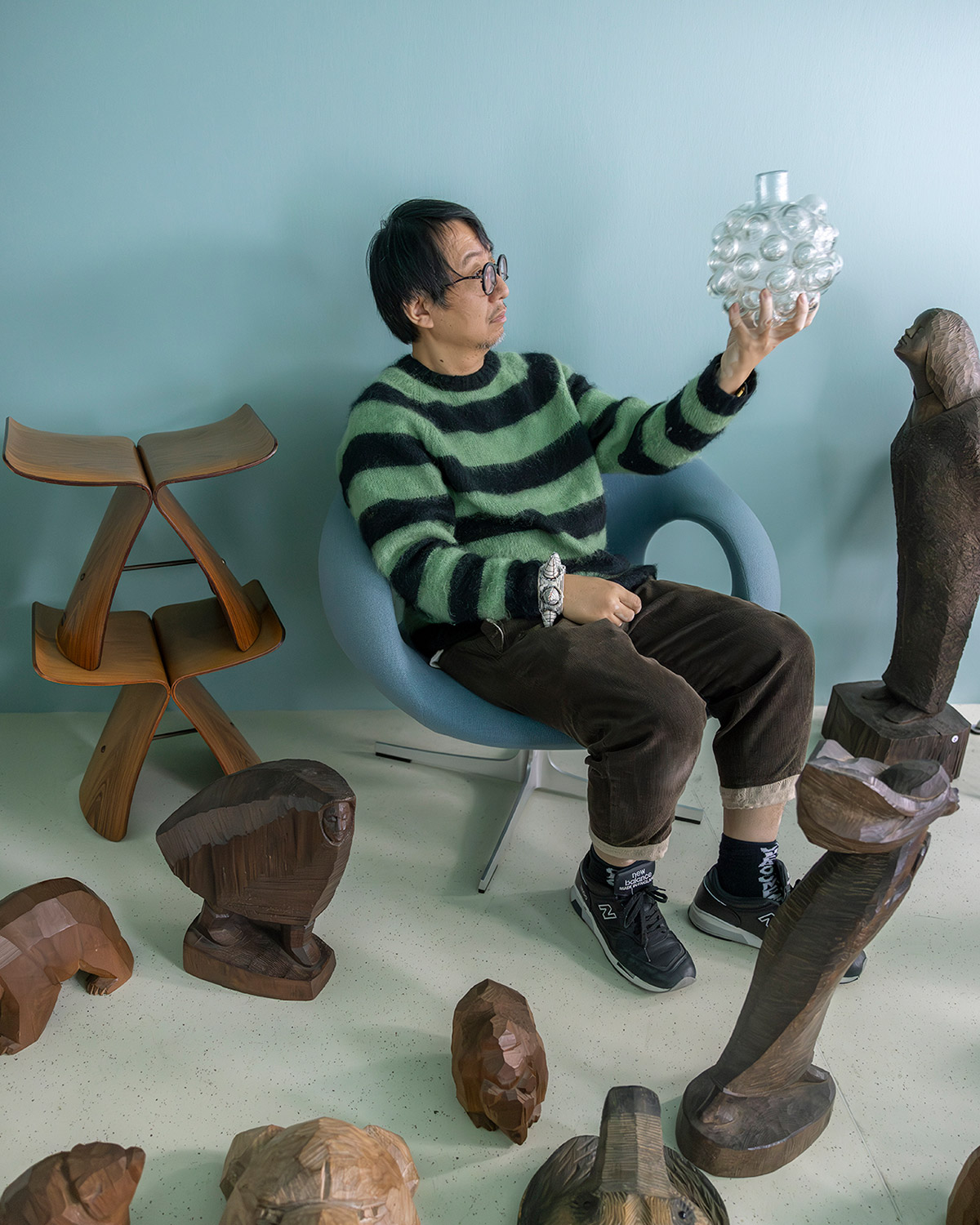 高校生時代に兄から譲り受けたマルコムXのユーズドTシャツが運命を変え、“散財王”までの茨ロードを歩き始めることに。古着というジャンルの無限沼にハマり、その王道を一気通貫。そこから蒐集の旅は拡大し、腕時計、写真集、ヴィンテージ家具、器やガラスなどの工芸品、北海道アートなどなどなど。守備範囲はまさに「エリア51」、イチローなのである。編集業、ギャラリー業でも類稀なる目利きの力を披露し続けるその審美眼は、すべて蒐集の課程で養われてきたものに違いない。