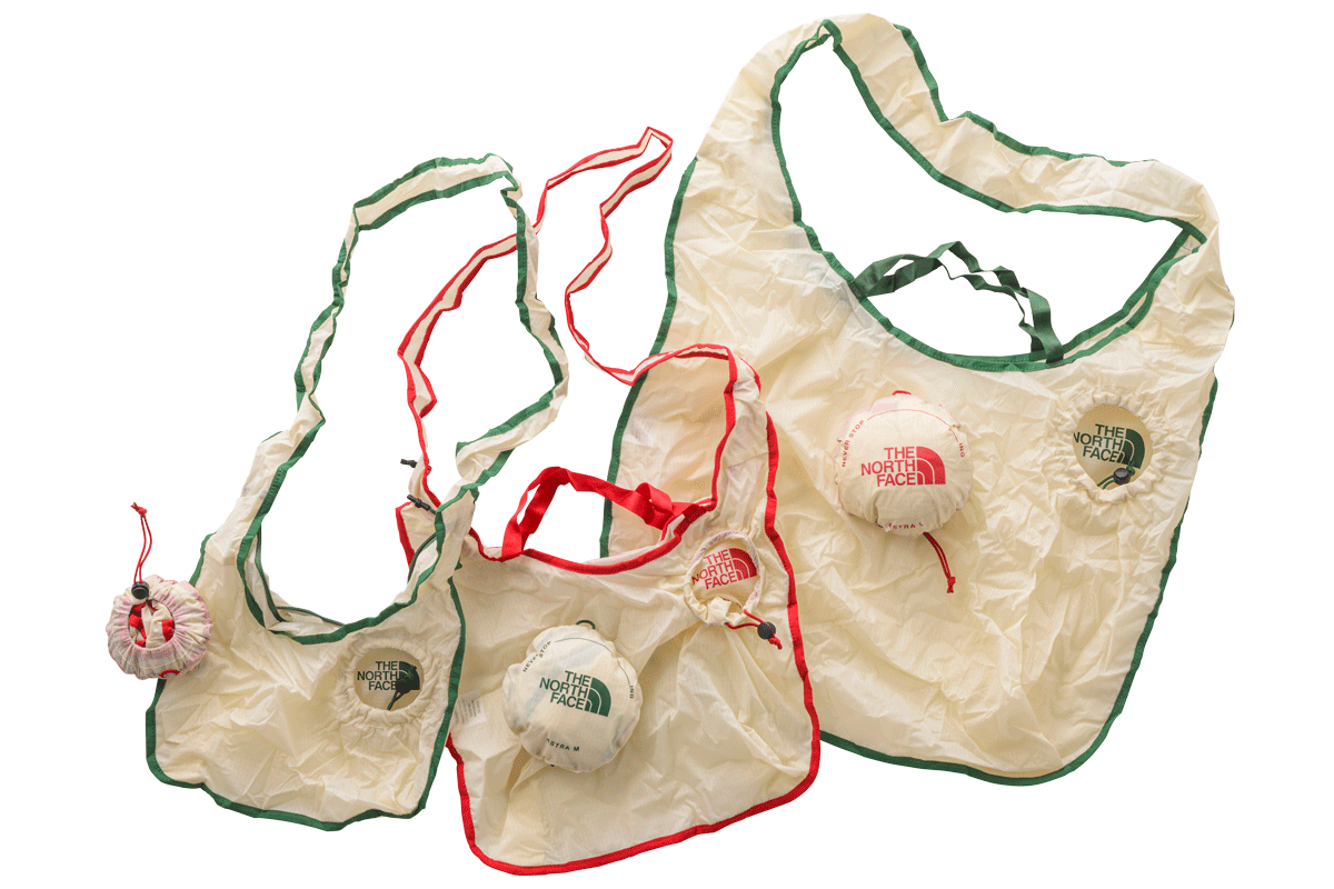 ブランドロゴが配された右上の丸枠に押し込むだけで、コインケースほどの大きさにパッカブル収納できるエコバッグ。40デニールのダブルリップストップナイロンは、軽さと耐久性を両立し、重くなりがちなスーパーでの買い物で大活躍。肩から掛けられるだけでなく、2つのグラブハンドルもあり、シーンに応じて持ち方を変えられる。容量3L、8L、24Lの全3サイズ展開。