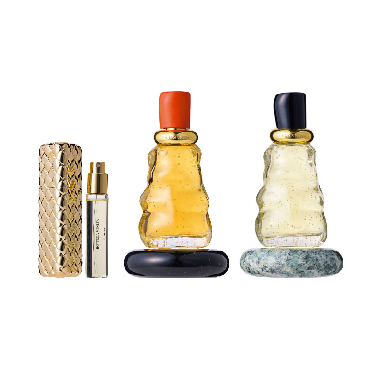左から/トラベルセット[ケース37,950円、オードパルファム 15㎖ 14,300円]、メッツァノッテ100㎖ 75,900円、フレグランス100㎖ 70,400円(ボッテガ・ヴェネタ ジャパン TEL:0120-60-1966)