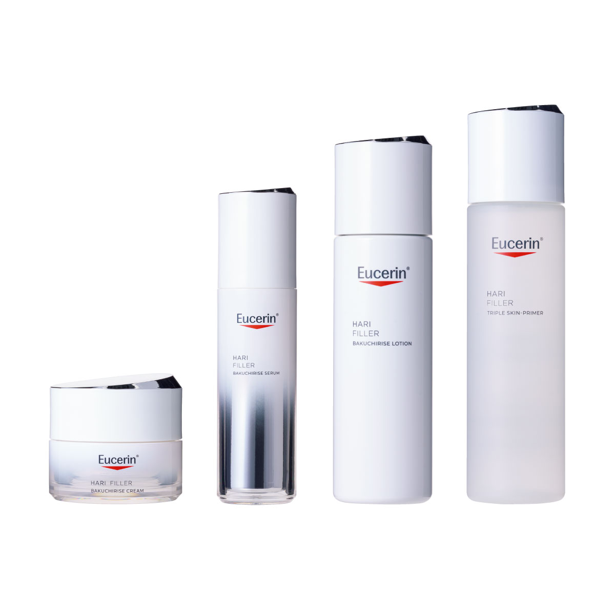 左から/ハリフィラー バクチライズクリーム 40g6,600円、同バクチライズセラム 40㎖ 8,800円、同バクチライズローション 150㎖ 4,400円、同トリプルスキンプライマー 180㎖ 3,300円(花王 TEL:0120-256-272)