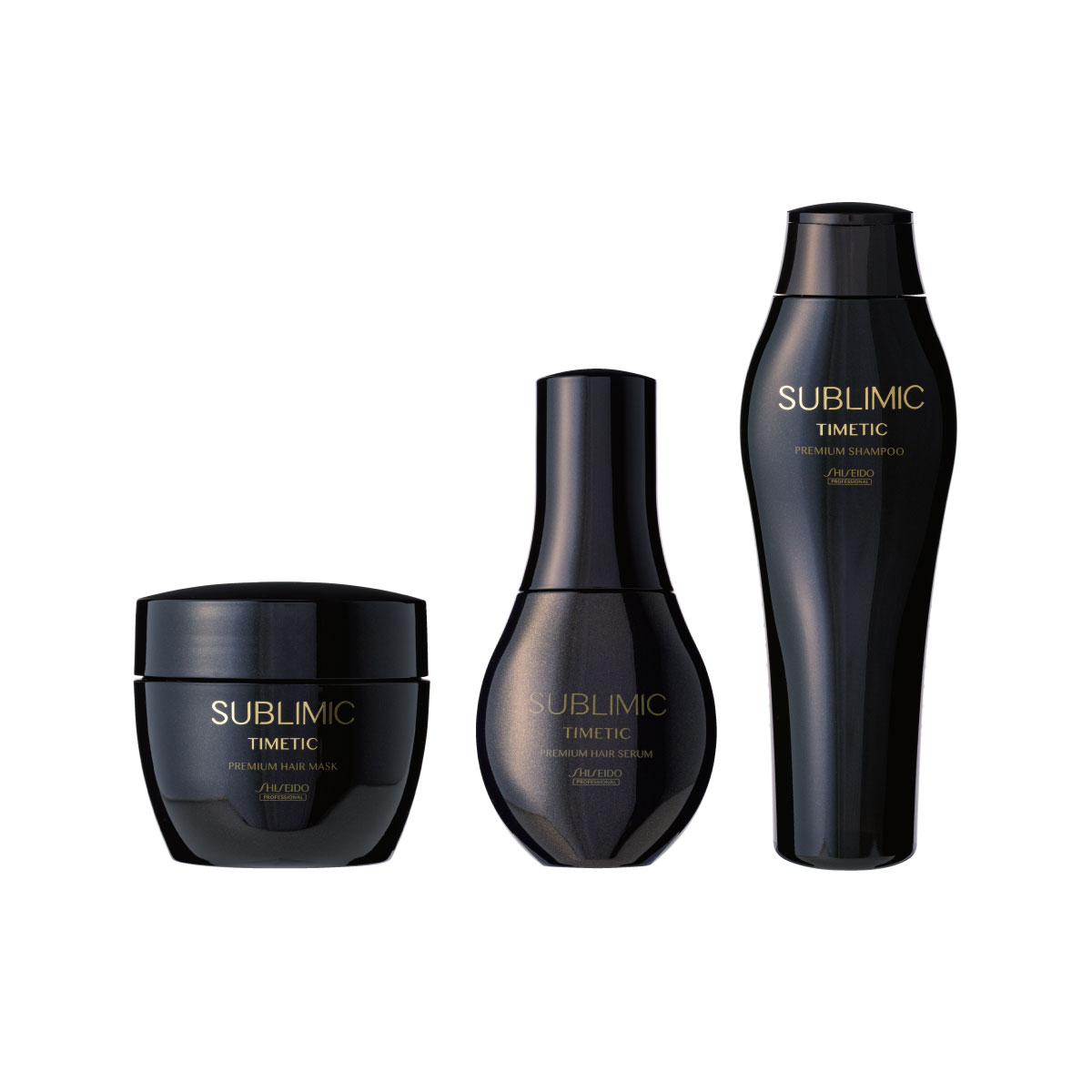 左から/タイムティック プレミアムヘアマスク 200g 13,200円、同ヘアセラム 110g 7,040円、同シャンプー 250㎖ 6,050円(資生堂プロフェッショナル TEL:0120-785-466)