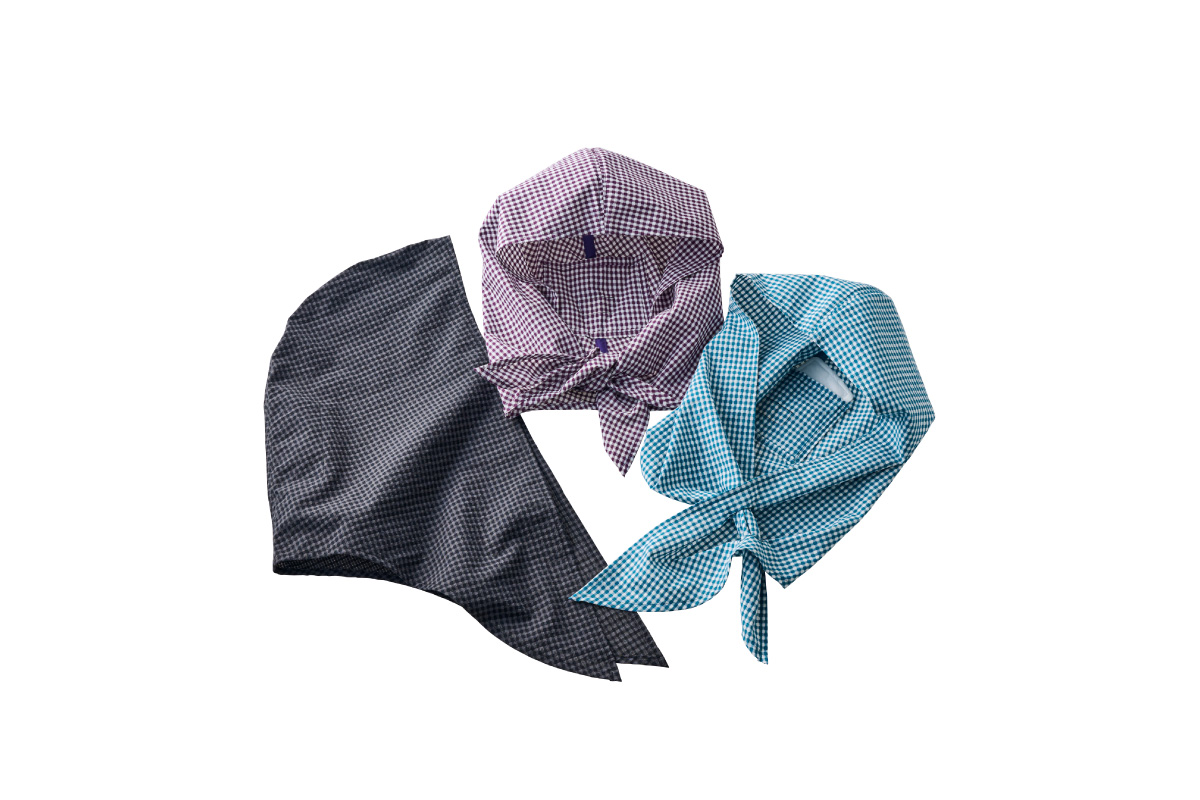ほっかむりのようなフォルムを描くギンガムチェックの新型のフード。きゅっと顎下で結ぶのはもちろん、片方の結び端に施されたスリットに、もう片方の結び端を通して留めることも可能。一枚でさらりと被ったり、キャップに重ねたり、ハットの下に仕込んだり、アレンジの幅は広い。首の後ろにはポケットもあり、冬はカイロ、夏は保冷剤を忍ばせておけば一年中快適に過ごせる。