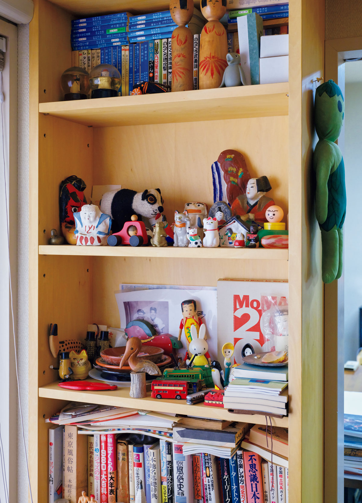 アトリエのデスク脇の棚。本とともに民藝玩具が並ぶ。お面やこけし、アメリカのキャラクタートイ、ぬいぐるみなども見える。エッセイの息抜きに棚を眺めていたのだろうか。