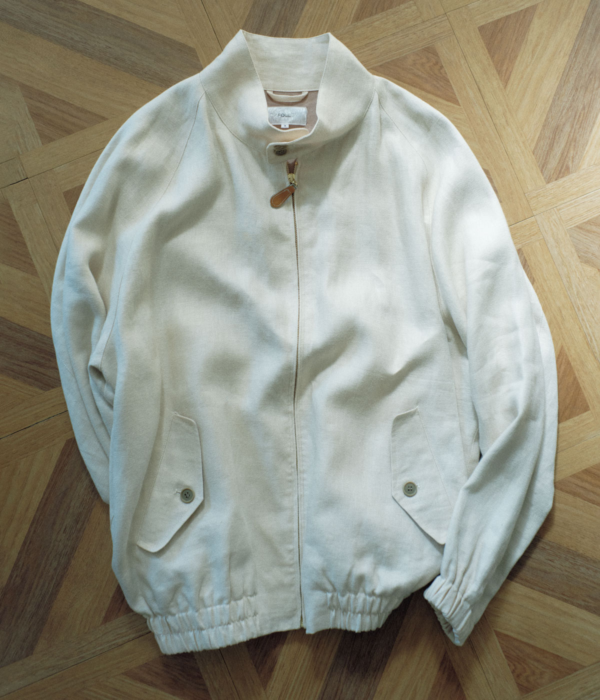 クラシカルなハリントンジャケットを柔らかな風合いのリネンギャバジンで。ラグランスリーブの立体的なフォルムで体に沿いながらも軽い着心地を実現。春先はニットの上からも着られるゆったりしたサイズ感もいい。レザースライダーが上品なアクセント。