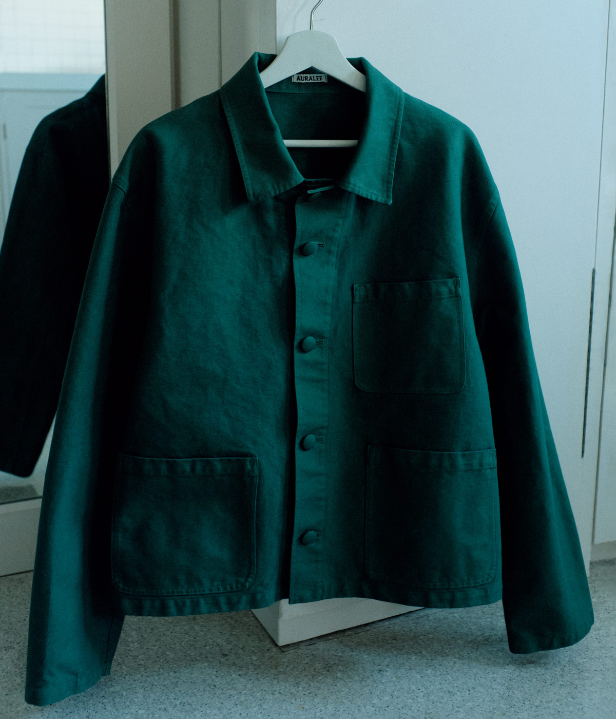鮮やかなグリーンが目を引くワークジャケット。ゆったりしたシルエットとショート丈に、上品なくるみボタンがどこか懐かしさも感じさせるデザイン。素材はオーガニックコットンを使用し、度目(どもく)を詰めて織り上げたヘビーツイル生地。製品染めによって独特のムラ感とハリのある質感を際立たせている。