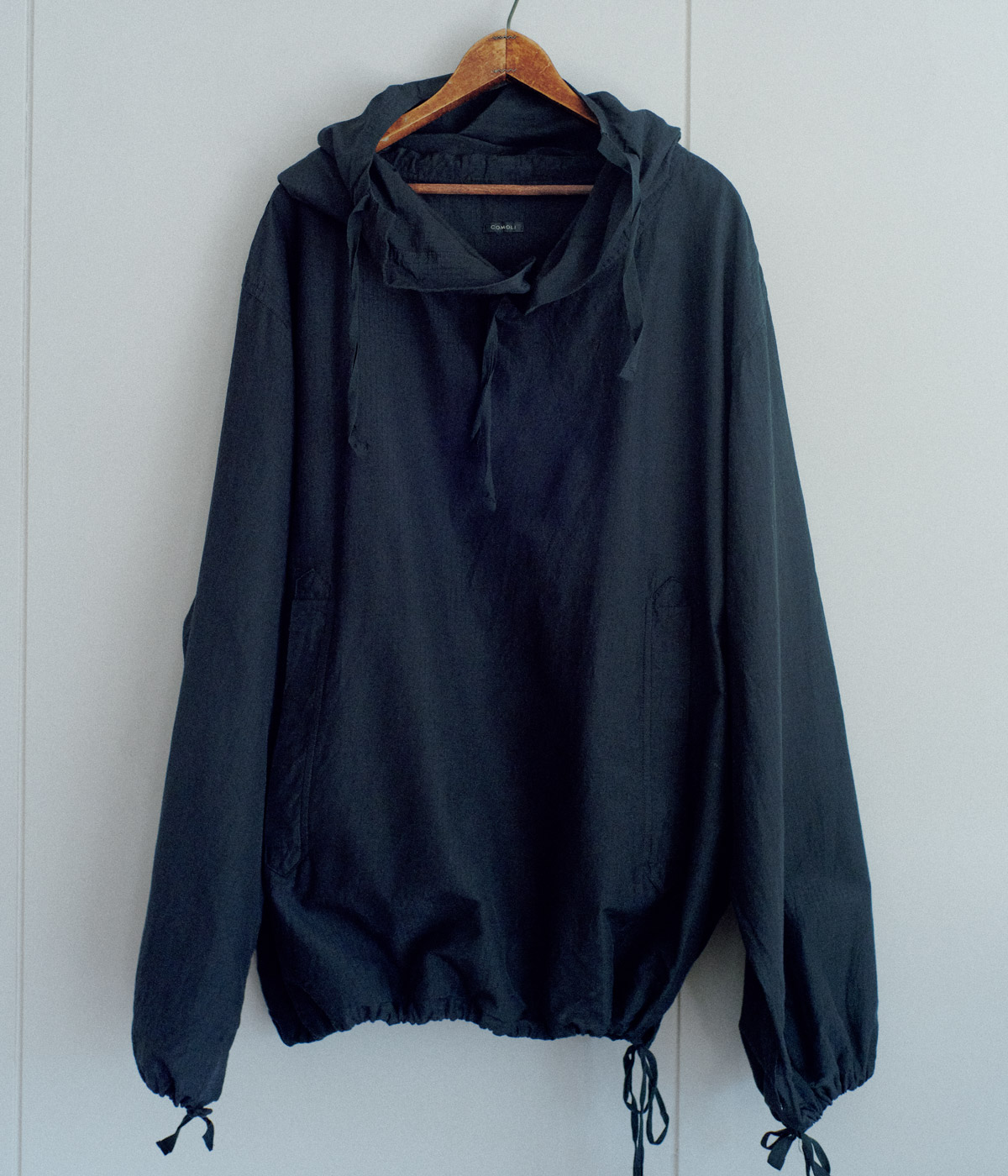 スナイパージャケットを思わせるゆったりしたサイズ感のスモックパーカ。少しつやのある素材はコットンシルクのリップストップ生地。薄手で軽くサラリとした肌触りと風通しの良い着用感はブランドならでは。フロントにはマフポケットを配し、大きめのフードは襟元をボタンで留める仕様。