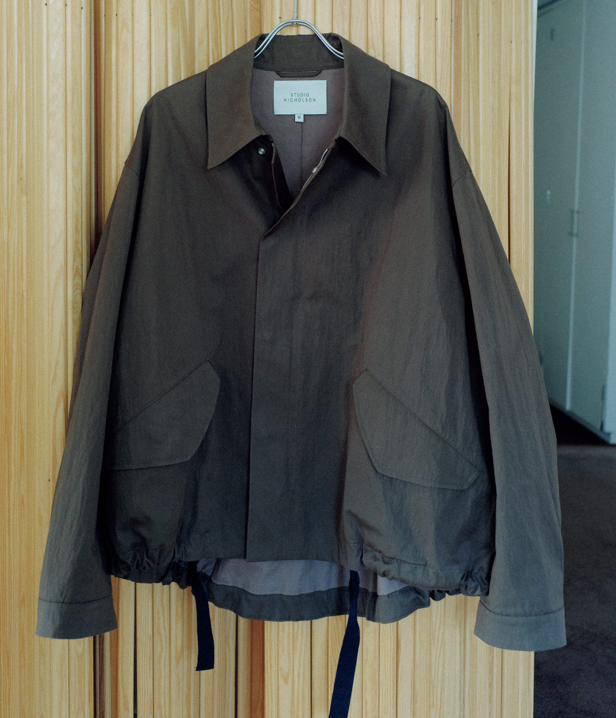 裾をヘリンボーンのドローコードで絞ったショートコートのようなデザインに2WAYジッパー+スナップの比翼仕上げがミニマルな印象。素材は韓国で開発されたコットンナイロンのウォッシュド・ウェザークロスで、ドライでやや張りのある風合いと撥水仕上げが特徴。