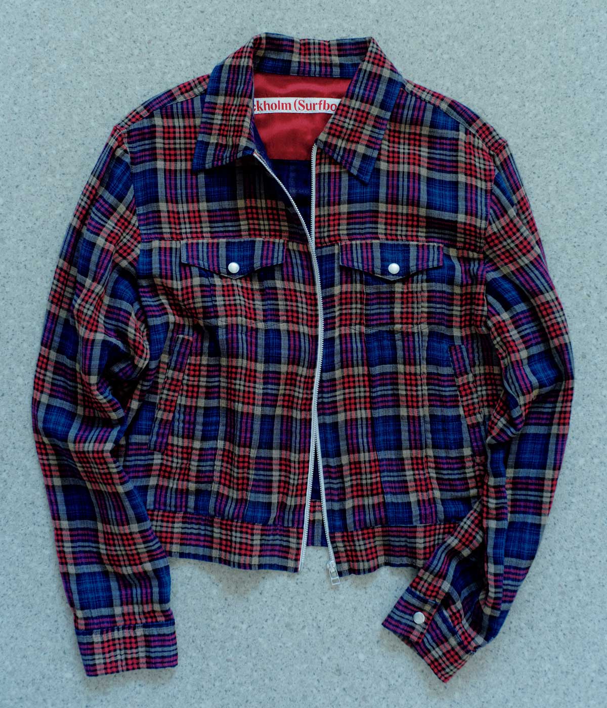 2019年に設立されたスウェーデンのサーフボード&ウェアブランド。ガーゼのようなごく薄手のコットンチェック素材を用いたトラッカージャケットは、柔らかで通気性が良く、着心地も軽やか。程よくリラックスしたレギュラーフィットのウエスト丈。