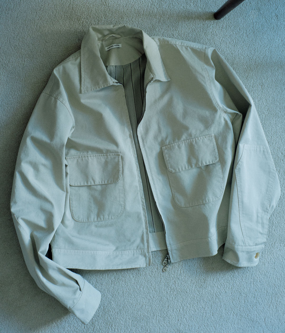 クラシックなアメリカンファッションをアップデートして提案するニューヨークのユニセックスブランド。チノ素材のハリントンジャケットは、ショート丈と低めの位置のチェストポケットが特徴。ストライプの裏地やエルボーパッチなど細部へのこだわりもいい。