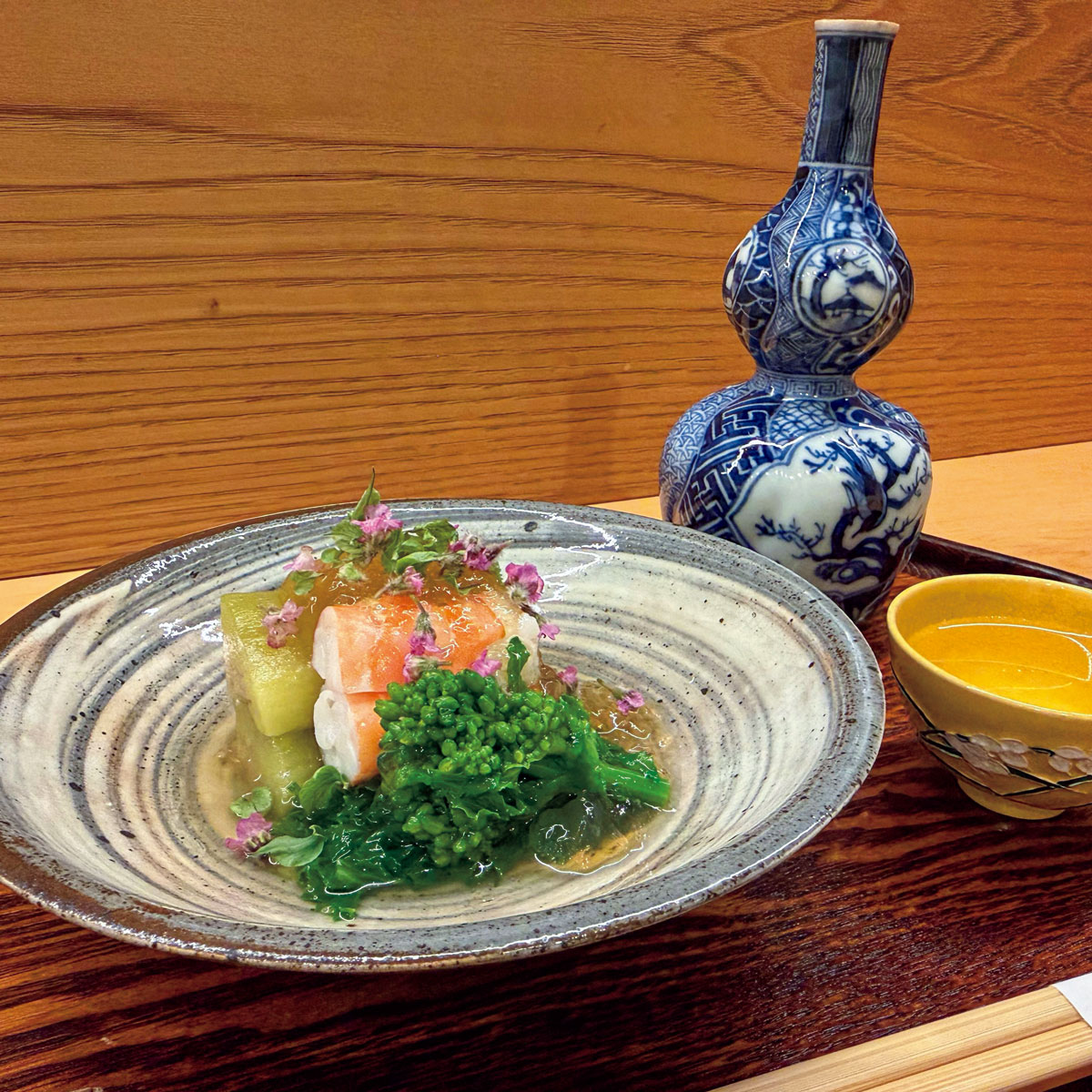 春野菜と足赤海老の酢ゼリーがけ1,650円。