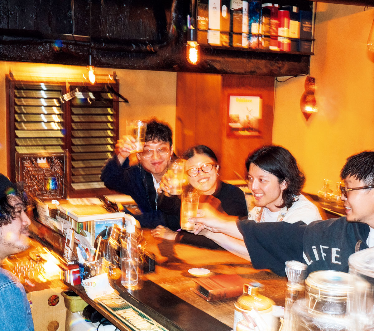 ───ここで渋谷から新宿へ。混雑する電車よりもバスで移動。普段は楽器運搬のため自家用車が多いという4人も、初めての都バスからの風景にご機嫌な様子。そして新宿〈BOX bar〉に到着。