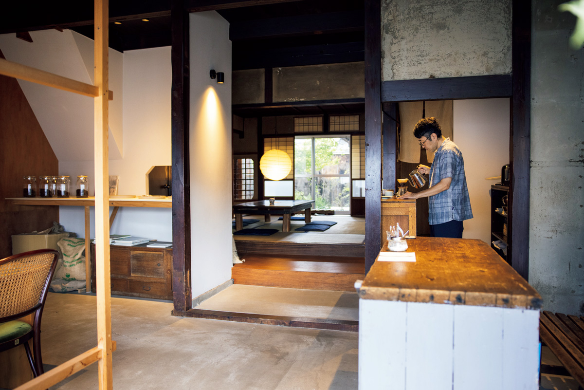 インバウンドとは無縁の、まっこと静かな西陣の住宅街に、店はある。白壁の引き戸を開けると、和洋が同居したゆったりとした空間が広がる。手前にはテーブル席と焙煎機、奥には町家の面影を残した広い座敷と裏庭が見える。店主は、飲食店などにも豆を卸している真下(ましも)裕也さん。