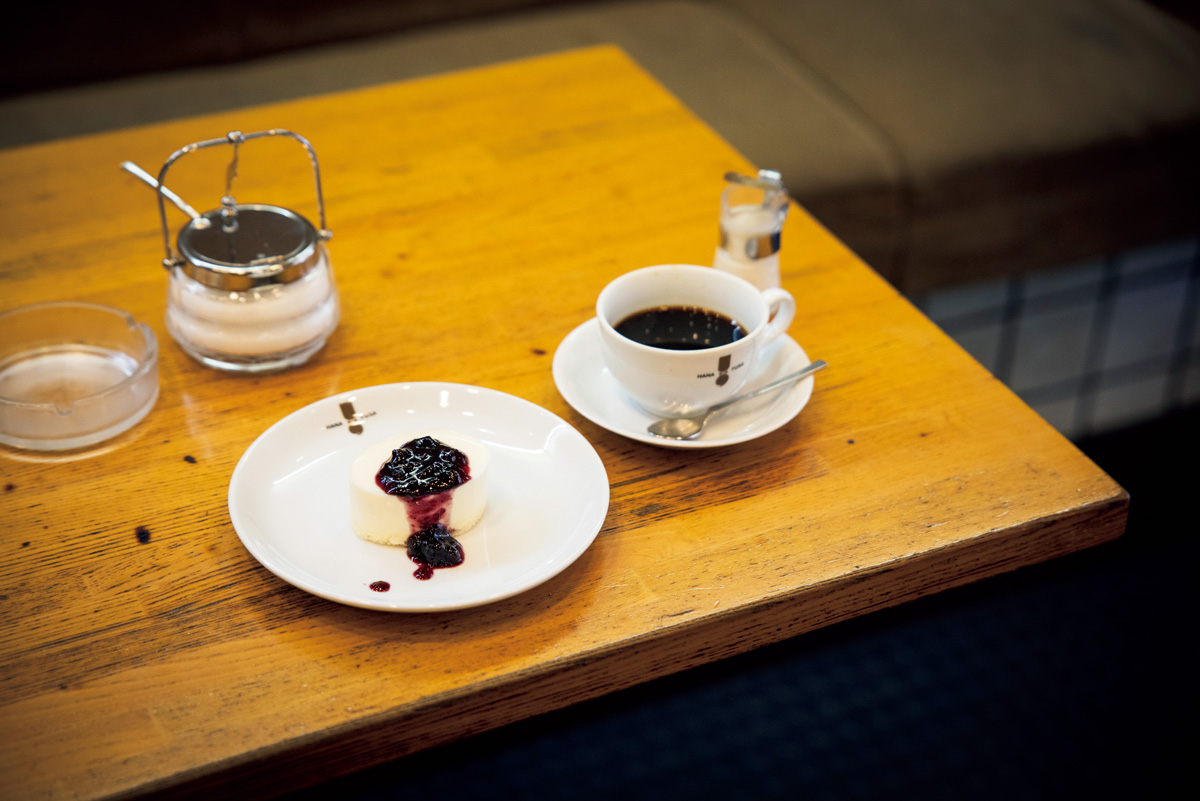一度ロートに沸き上がったコーヒーが、下のフラスコに落ち始めるや、再び加熱して沸き上げ、どっしりと濃厚な味わいに仕上げるのがはなふさ流。良き相棒である自家製チーズケーキも40年以上続くロングセラーだ。