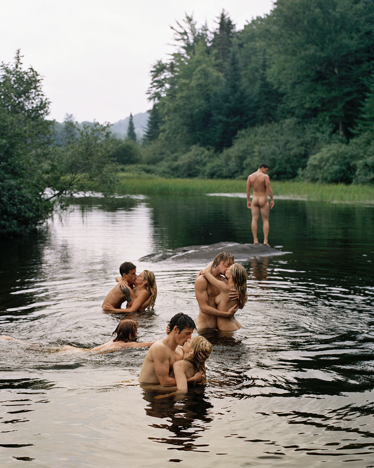 アバクロンビー&フィンチの撮影をしている時に、たくさんのカップルに池の中に入ってもらったんだ。彼らはみんなキスをしていて、私は思わずつぶやいた、『ああ、自分が若かったら、この写真の中に入りたい!誰かがこの中に入った自分を撮ってほしい』と。そんな感情を持って写真を撮り終えて、彼らが池から上がってきた。彼らは実にフレンドリーで、男たちは女性たちに優しく、女性たちも男性たちに、またふたりの女性はお互いに親密で、ふたりの男は互いの腕を絡めあっていた。私はその光景を見て高揚して、自分は彼らのためにいいことをしたし、それはまた自分のためでもあると思ったんだ。撮影を終え、皆が池から出て身体を拭いて服を着て、私たちは車で移動した時にパトカーが近づいてきて、警察官が私たちに問いかけたんだ、『池にたくさんのヌードの人物がいるという通報受けたんだが、知っているか?』って。『私は何も見てないよ』って答えたよ(笑)」